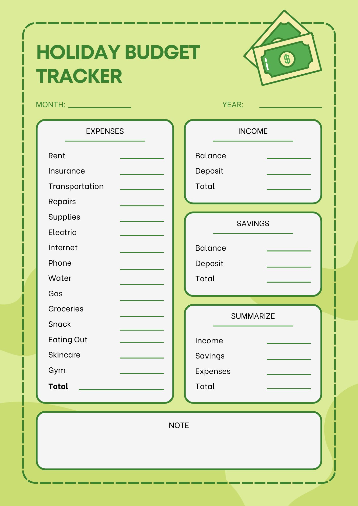 The Holiday Budget Tracker helps plan and manage holiday expenses like gifts, decorations, and travel. It’s perfect for creating a budget, tracking spending, and staying financially organized during the festive season.