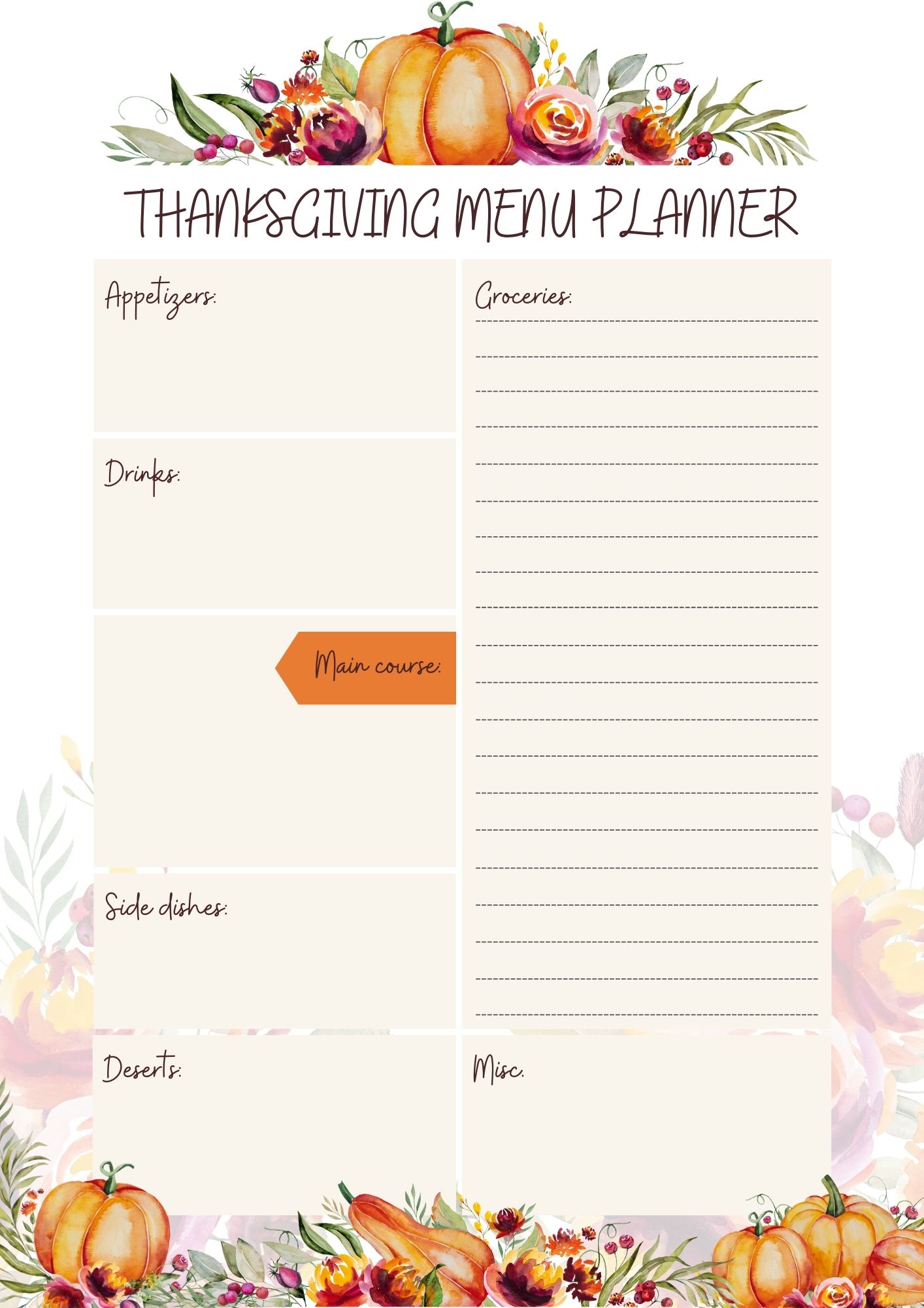 The Thanksgiving Menu Planner helps you organize recipes, ingredients, and cooking schedules for a stress-free holiday feast. It’s perfect for planning appetizers, mains, sides, and desserts while staying on top of your Thanksgiving preparations.